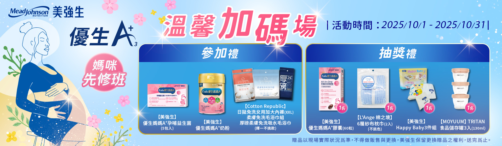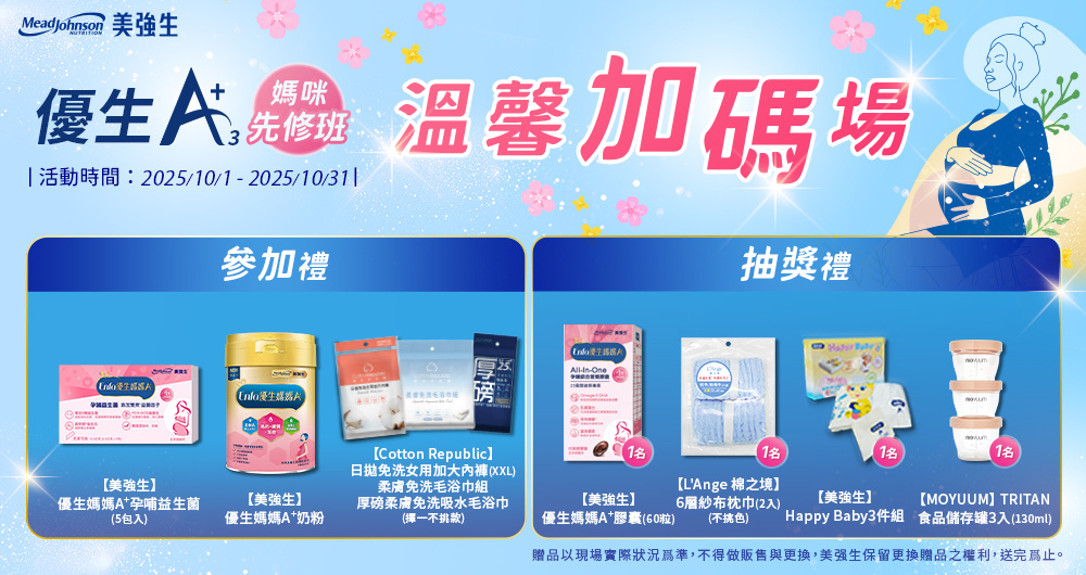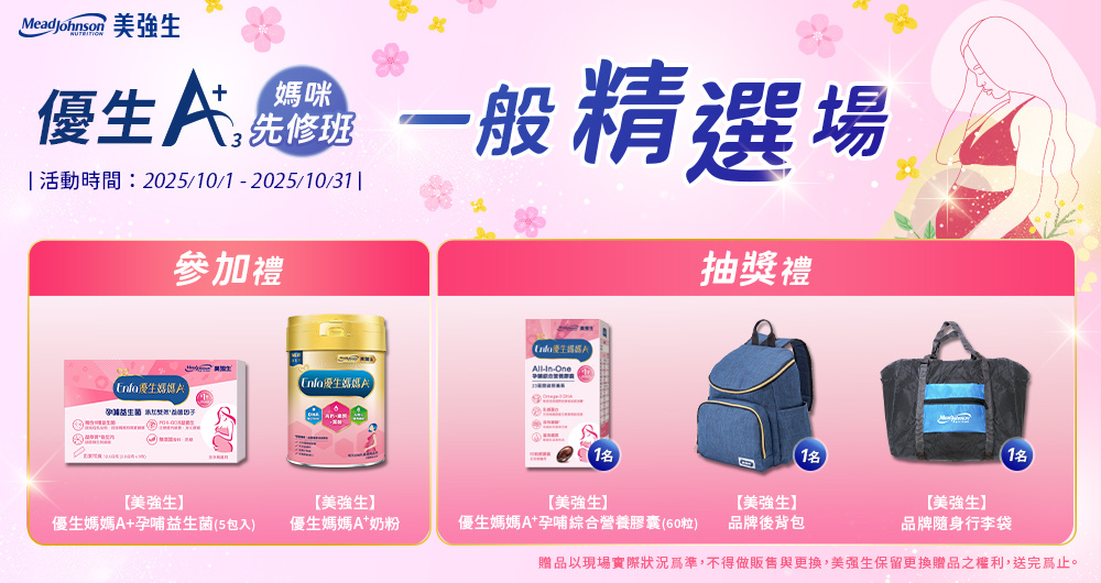 完成課程即可獲得「參加禮:【美強生】優生媽媽A+孕哺益生菌(5包入)、【美強生】優生媽媽A+奶粉」