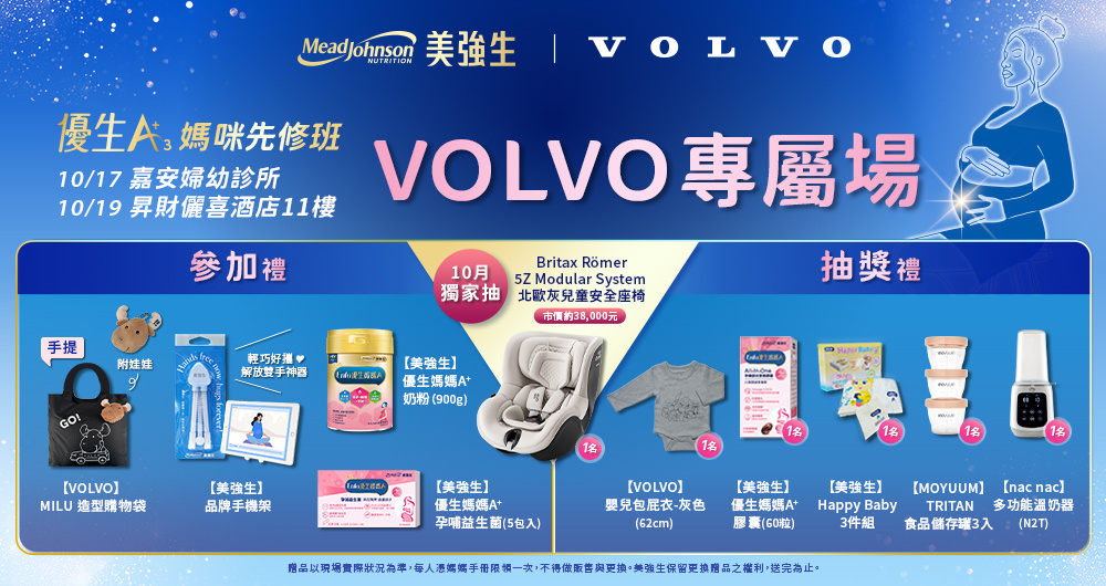 註1:贈品以現場實際狀況為準,為嘉惠所有媽媽,凡參與過實體媽媽教室(包含一般場次及溫馨加碼場次) ,每人憑媽媽手冊每胎次限領取一次贈品,不得做販售與更換。