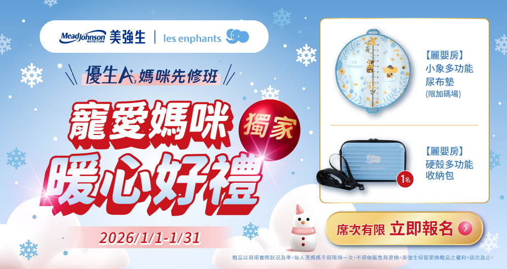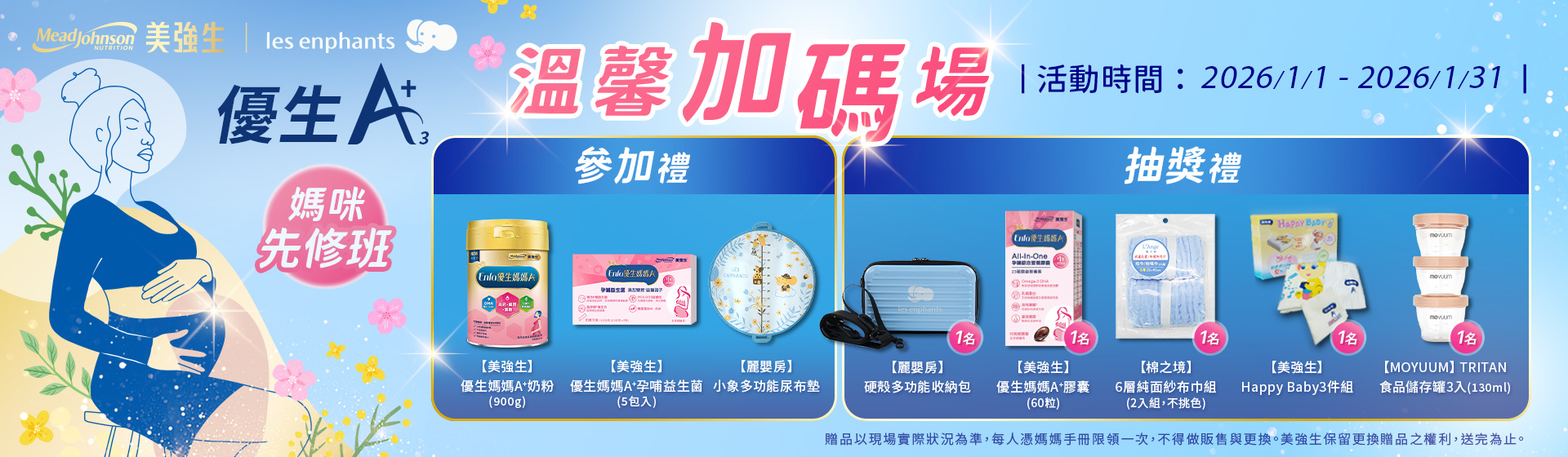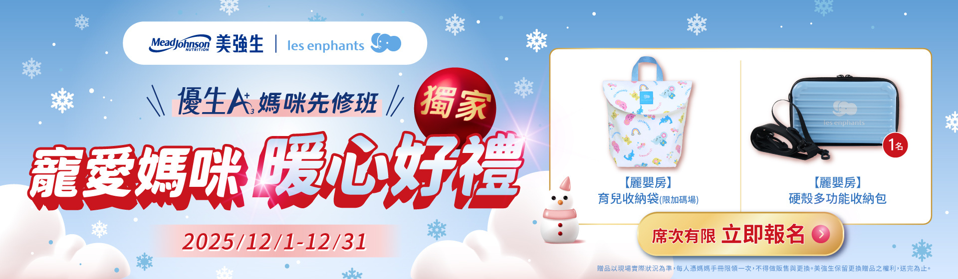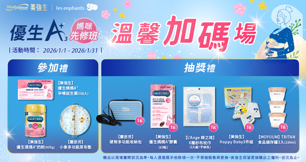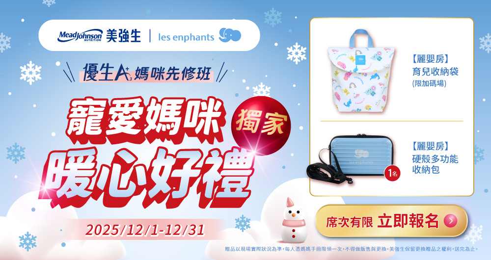 完成課程即可獲得「參加禮:【麗嬰房】育兒收納袋、【美強生】優生媽媽A+孕哺益生菌(5包入)、【美強生】優生媽媽A+奶粉」
