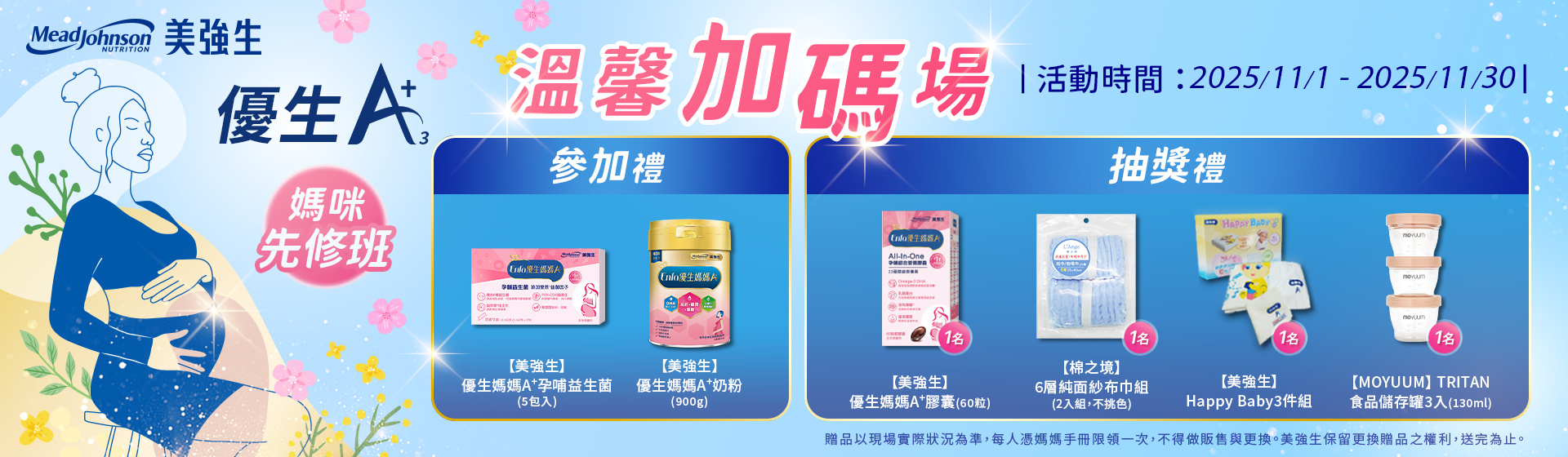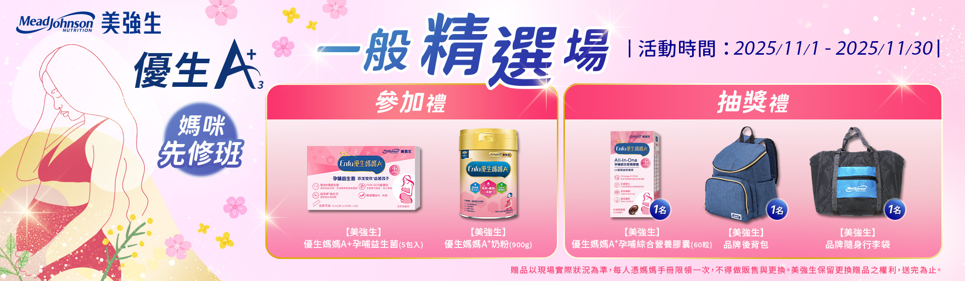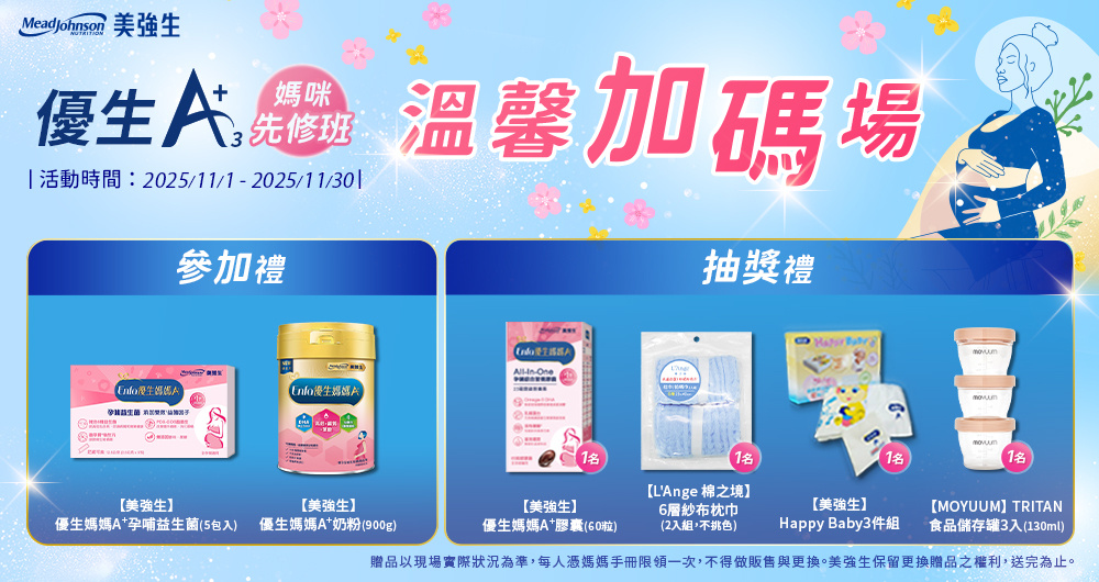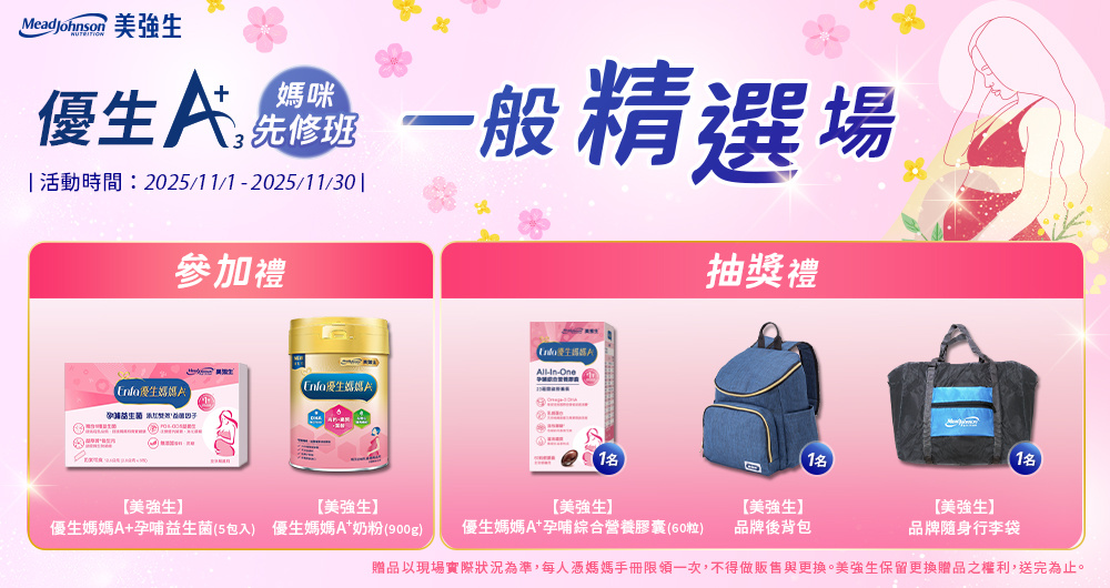 完成課程即可獲得「參加禮:【美強生】優生媽媽A+孕哺益生菌(5包入)、【美強生】優生媽媽A+奶粉」