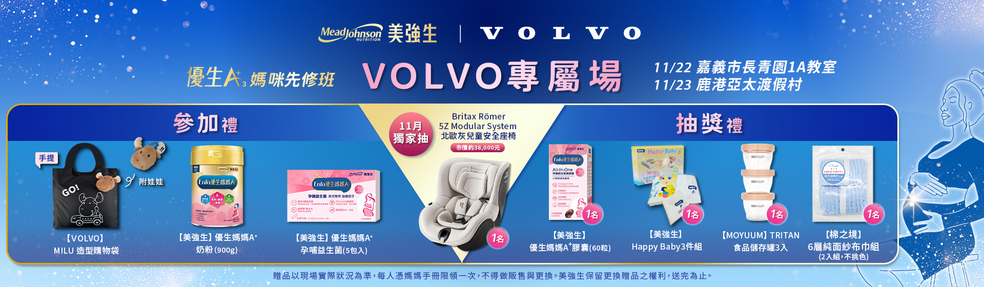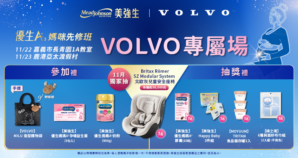 註:贈品以現場實際狀況為準,為嘉惠所有媽媽,凡參與過實體媽媽教室(包含一般場次及溫馨加碼場次) ,每人憑媽媽手冊每胎次限領取一次贈品,不得做販售與更換。