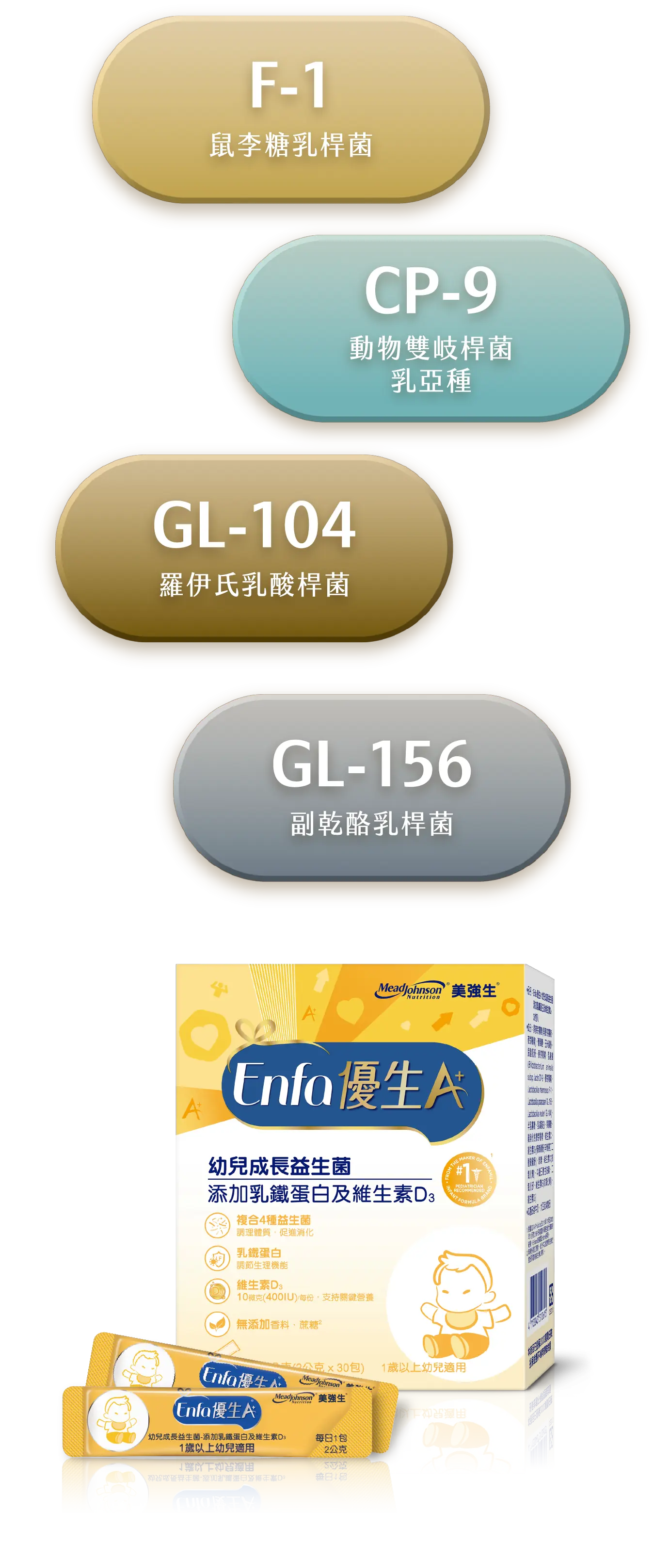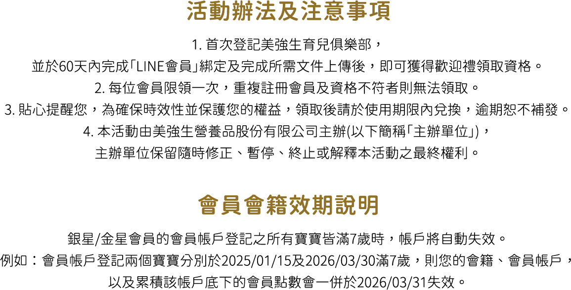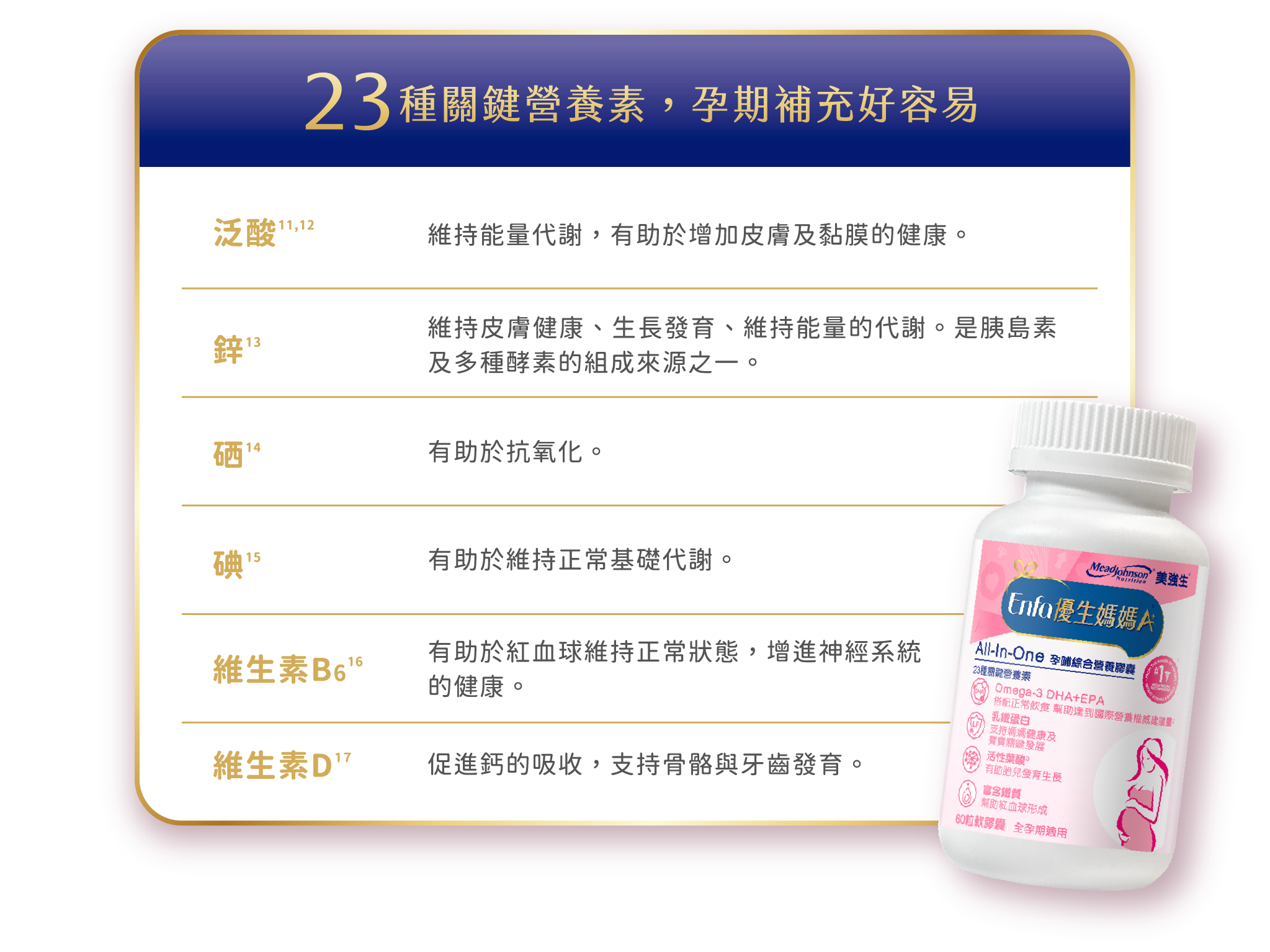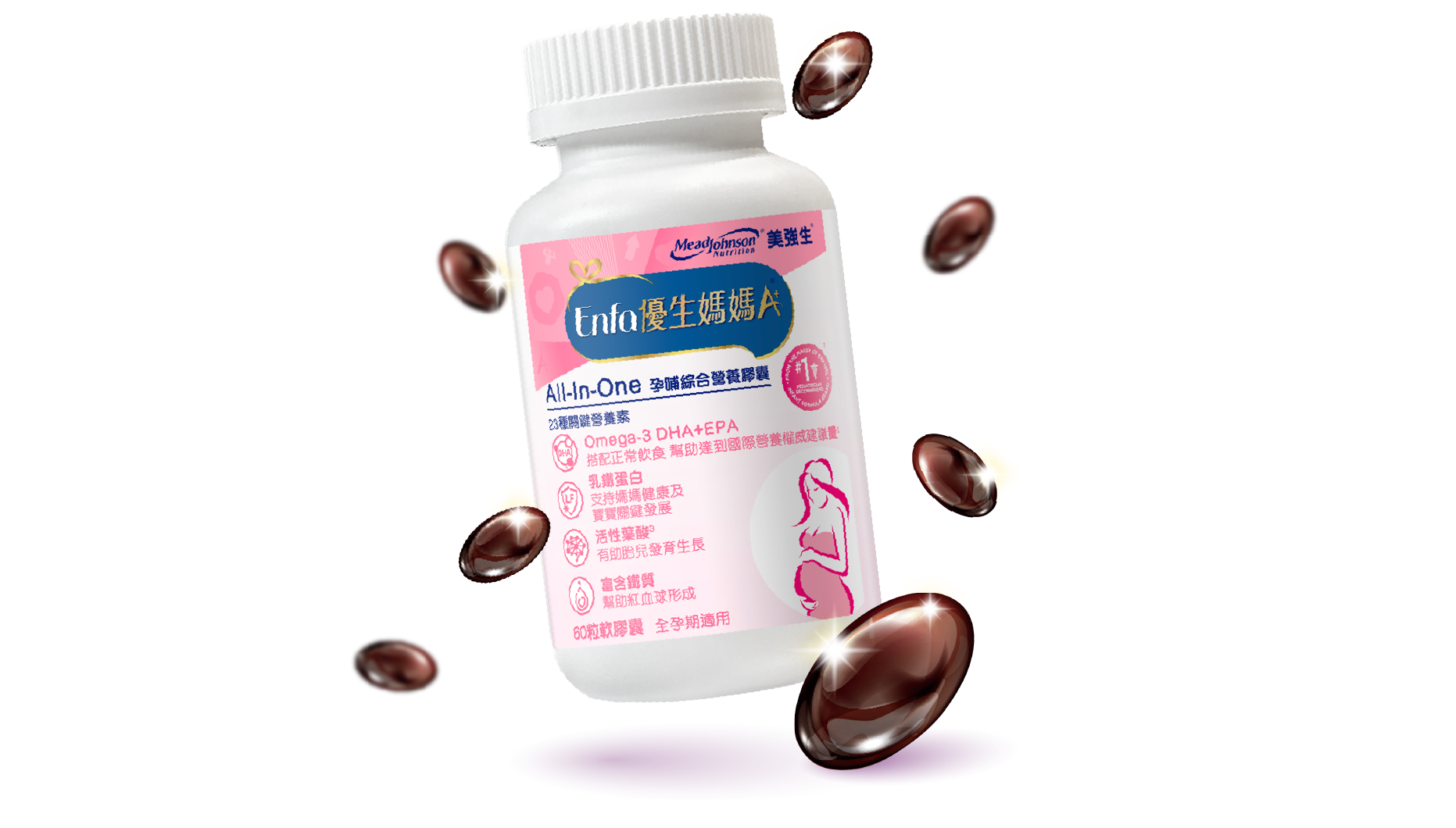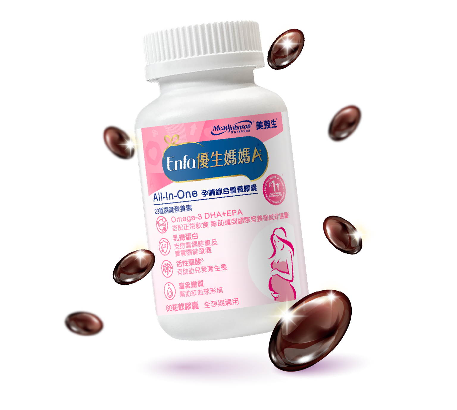 美強生期待與您走過從胎兒到幼兒的發展,以專業營養守護每個珍貴成長的瞬間,幫助媽媽一同與寶寶健康發展。全新推出Enfa 優生A+母嬰保健系列產品,提供孕哺嬰兒營養。Enfa 優生媽媽A+孕補綜合營養膠囊含乳鐵蛋白、鐵、葉酸、DHA等23種關鍵營養素,其中乳鐵蛋白可以調整體質、增強體力,有助於孕哺乳媽媽的健康維持,DHA 是胎兒發育的關鍵脂肪酸,活性葉酸一份達535微克,有助胎兒成長、核酸與核蛋白的發展,活性甘胺酸亞鐵可顯著提高鐵的吸收率並降低刺激感,還有泛酸、鋅、碘、硒、維生素,幫助身體代謝、抗氧化、增進皮膚健康等。早晚各一粒,幫助補充孕早、中、晚期關鍵營養素。成為美強生金星會員享有豐富的課程、產品體驗大禮包與點數獎勵方案。